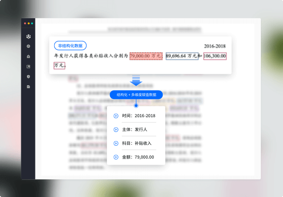 金年会jinnian财务报表解析与核查系统,整合行业领先的智能文本解析技术与丰富的金融行业项目经验,融合了大量业务专家专业知识及职业判断。相较于同类产品,财务逻辑更准确,数据的识别与填列更加精准...